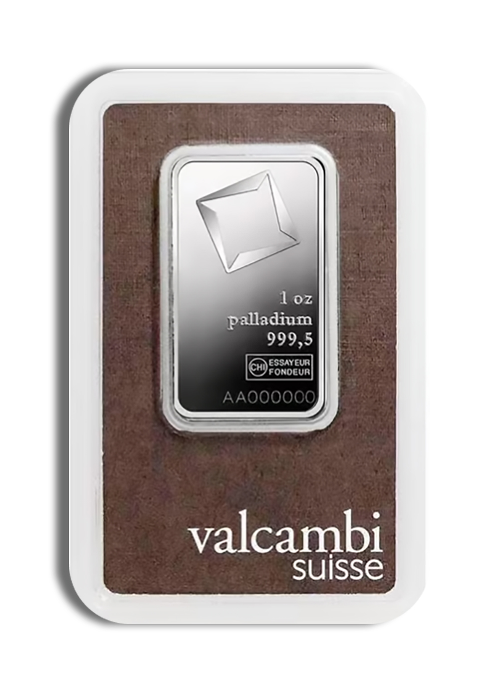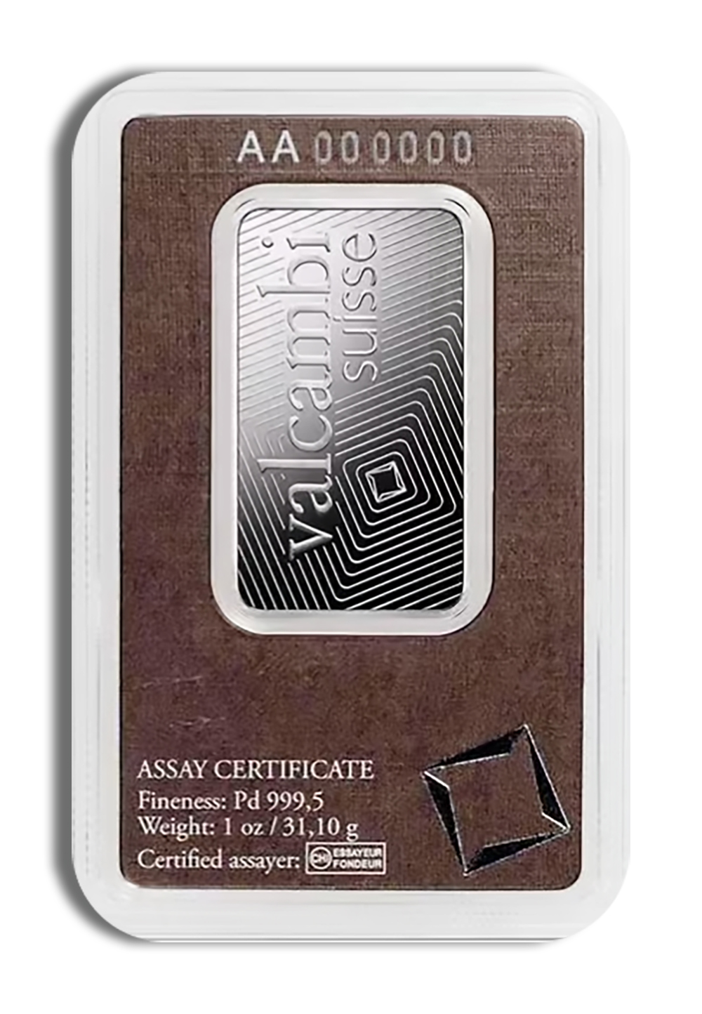 A: The sealed assay card certified by Valcambi itself guarantees the palladium’s precise purity and content while protecting pristine condition.