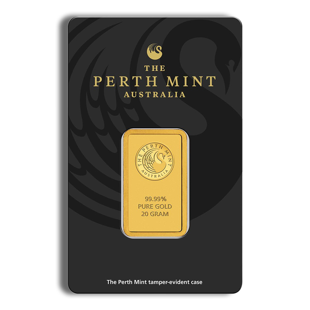 Diversify your gold holdings with the trusted 20 gram Gold Bar from the Perth Mint, available now in a secure carded package through Atlas Bullion.