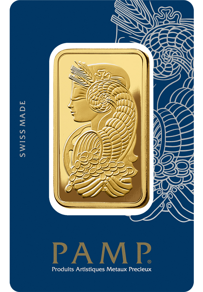 Enhance your collection with the 50 gram Gold Bar PAMP Fortuna, struck by PAMP Suisse. This iconic bar features the beautiful image of Lady Fortuna, the Roman goddess of fortune, and is sealed in a carded format for protection and authenticity. Combining high gold content with exceptional craftsmanship, this bar is a practical and elegant way to invest in gold.